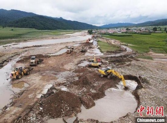 工程車輛正在搶修道路。(無人機(jī)照片) 記者 蒼雁 攝