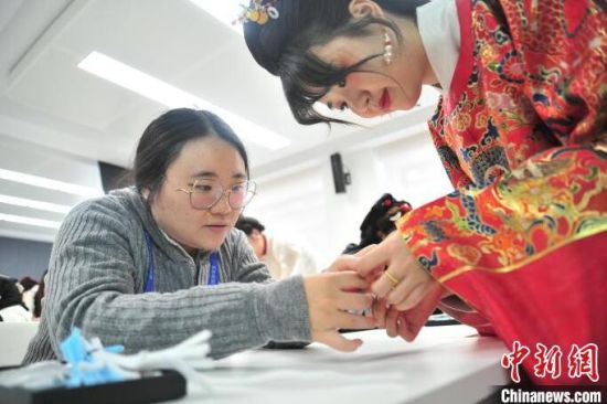1月23日,巫珮瑄(左)在吉林長春學(xué)習(xí)制作漢服手工仿絨花雪花胸針!