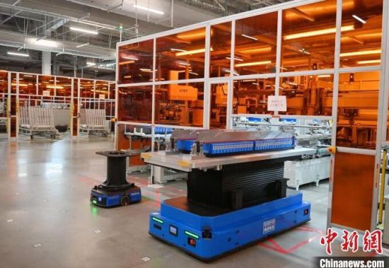 AGV配送車在運送電芯。張瑤 攝