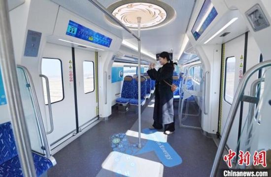 3月21日,全球首列氫能源市域列車在長春進(jìn)行時速160公里滿載運(yùn)行試驗(yàn)。圖為列車車廂內(nèi)部。中新社記者 張瑤 攝