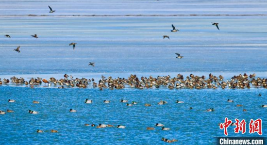 3月15日,松原查干湖候鳥在冰上覓食、休憩!±铢i程 攝