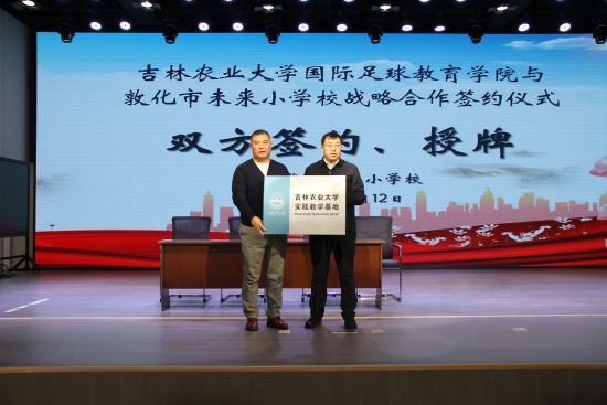 敦化市未來小學(xué)校校長吳旭晶同志致歡迎詞。隨后,吉林農(nóng)業(yè)大學(xué)國際足球教育學(xué)院副書記趙立剛同志講話,介紹本次合作將以校園足球發(fā)展為核心,以課程共建與師資培訓(xùn)為重點(diǎn),著力構(gòu)建校地協(xié)同的長效機(jī)制。儀式現(xiàn)場,敦化市教育局與吉林農(nóng)業(yè)大學(xué)國際足球教育學(xué)院簽署了《校外實(shí)踐教學(xué)基地共建協(xié)議書》,吉林農(nóng)業(yè)大學(xué)國際足球教育學(xué)院張志成院長授牌。授牌結(jié)束后,吉林農(nóng)業(yè)大學(xué)國際足球教育學(xué)院向未來小學(xué)捐贈了足球訓(xùn)練裝備,以實(shí)際行動(dòng)為校園足球發(fā)展助力。與此同時(shí),學(xué)校向長期支持教育的企業(yè)代表贈送錦旗,企業(yè)代表分享了助力教育發(fā)展的理念。