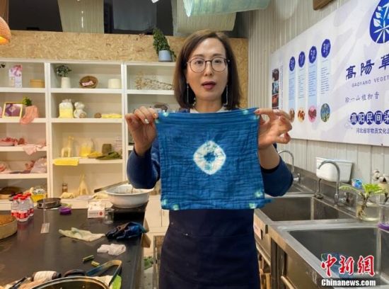 圖為10月28日,段惠展示草木染及傳統(tǒng)扎染技藝制作的藍(lán)布。 中新社記者 李曉偉 攝