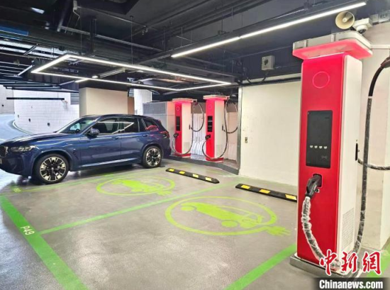 圖為華為在香港將軍澳藍(lán)塘匯商場(chǎng)停車場(chǎng)內(nèi)設(shè)置的充電站!∠愀廴A為國(guó)際有限公司供圖