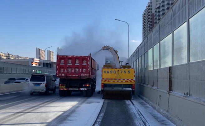 李文秀介紹,早高峰結(jié)束后,次要街路立即啟動全面清雪作業(yè);針對快速路及主要街路路面積雪已被車輛壓實(shí)的情況,已第一時(shí)間采取融冰融雪處置措施,于中午12時(shí)以后啟動反復(fù)清掃作業(yè),同步調(diào)配運(yùn)雪車輛開展邊清邊運(yùn),最大限度降低路面積雪存量。
