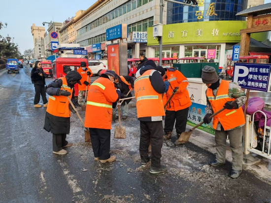 同時走訪沿街商戶、商場,督促相關負責人及時清除背光區(qū)冰面,清理時根據(jù)實際情況采用人工清理和撒布融雪劑相結(jié)合的方式,確保道路整潔安全。本次行動,城管執(zhí)法局出動執(zhí)法人員及環(huán)衛(wèi)人員共計200余人,廣泛動員臨街商戶、相關單位積極配合,投入到除冰工作中來。