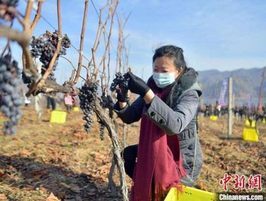 鴨綠江河谷冰葡萄進(jìn)入最佳采摘時期,游客在采摘冰葡萄。