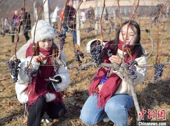 12月9日,吉林集安鴨綠江河谷,游客采摘冰葡萄。集安市所在的鴨綠江河谷與法國著名葡萄酒產(chǎn)地羅納河谷處于同一緯度,同屬世界葡萄酒黃金生產(chǎn)帶,當(dāng)?shù)厮a(chǎn)的冰葡萄是釀制冰酒的主要原料。目前,鴨綠江河谷冰葡萄已經(jīng)進(jìn)入最佳采摘時期。(完)