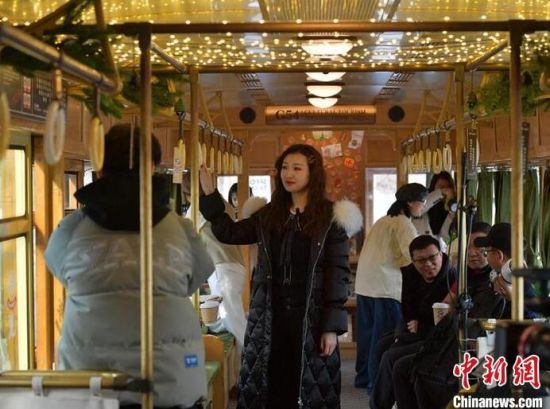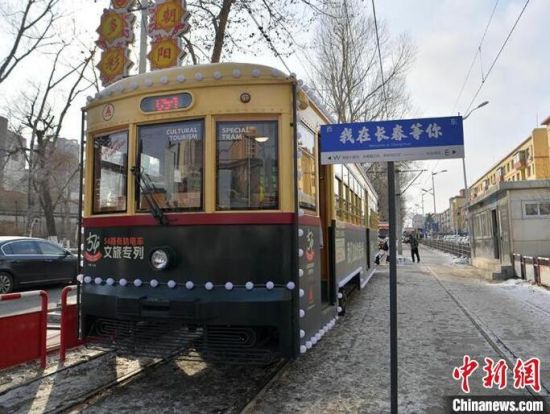 1月8日,吉林長春,一輛54路有軌電車文旅專列吸引游客打卡拍照。該專列外形復(fù)古,車廂布置獨具特色,游客預(yù)約后可購票乘車體驗車內(nèi)及市區(qū)沿線的人文風(fēng)情。