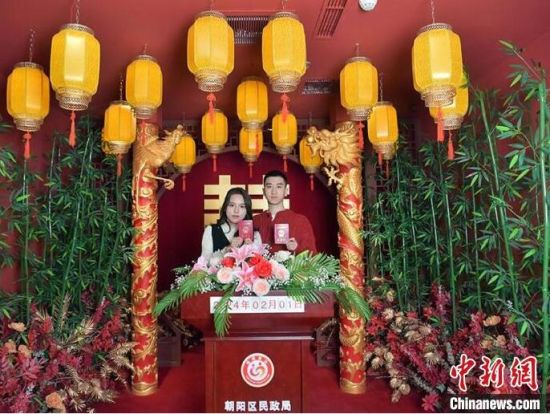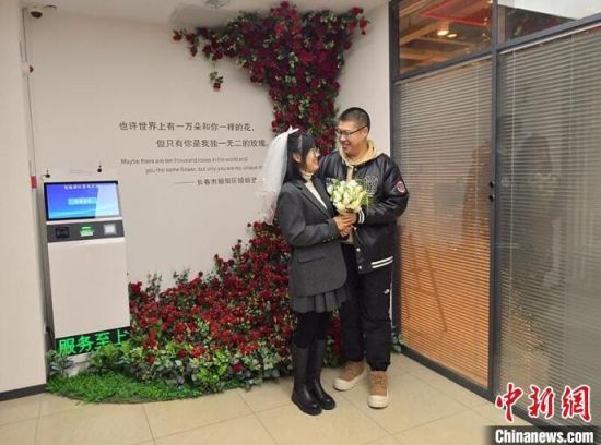 2月1日,在長春市朝陽區(qū)婚姻登記處,多對新人在辦理結(jié)婚登記。該婚姻登記處近日打造了三種不同風格的拍攝場景,并為新人準備了鮮花、婚紗以及特色服裝等,給前來登記結(jié)婚的新人一個大大的驚喜。