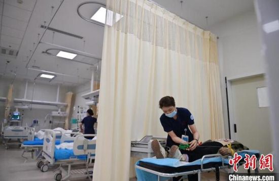 張力(中)在護理病人。急診科的工作環(huán)境突發(fā)情況多、體力消耗大,所以對急診護士的抗壓能力和應(yīng)變能力要求也更高。 張瑤 攝