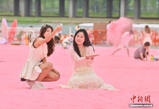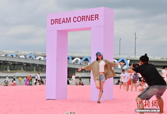 7月24日,長春市一處人工打造的粉沙灘吸引眾多游客前來打卡。這片沙灘呈現(xiàn)出夢(mèng)幻的粉色,搭配周邊綠植和休閑設(shè)施,營造出浪漫氛圍。中新社記者 張瑤 攝