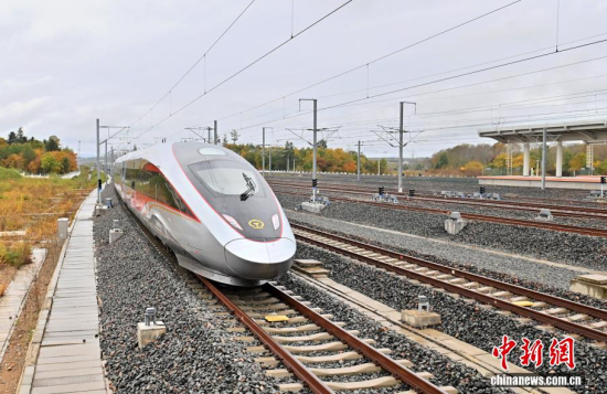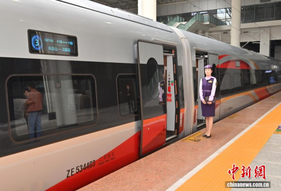 9月28日,G8166次列車從長(zhǎng)白山站始發(fā),駛向終點(diǎn)站沈陽(yáng)北站,沈白高鐵正式開(kāi)通運(yùn)營(yíng),結(jié)束了吉林省通化、白山兩市不通高鐵的歷史,北京朝陽(yáng)站、沈陽(yáng)北站至長(zhǎng)白山站的最短旅行時(shí)間分別為4小時(shí)33分、1小時(shí)53分。作為中國(guó)東北高鐵網(wǎng)重要組成部分,該線路對(duì)暢通區(qū)域經(jīng)濟(jì)循環(huán)、促進(jìn)沿線旅游資源開(kāi)發(fā)等具有重要作用。中新社記者 張瑤 攝