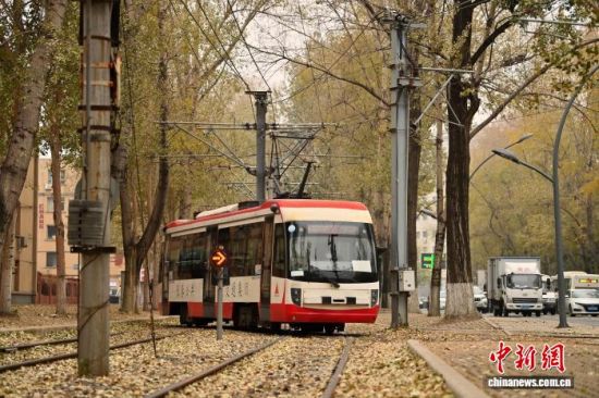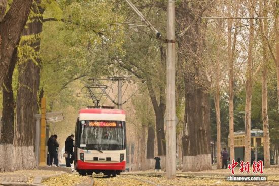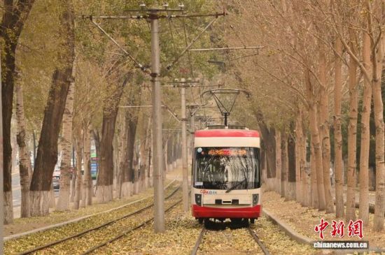 11月5日,吉林長(zhǎng)春秋意正濃,一處軌道兩旁的樹(shù)葉泛黃,有軌電車宛如在畫中穿行。中新社記者 張瑤 攝