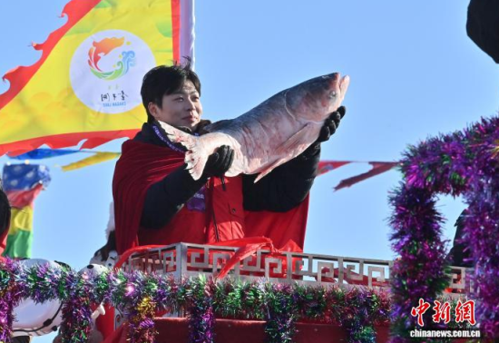 1月8日,吉林·松原查干湖第24屆冰雪漁獵文化旅游節(jié)開幕。當(dāng)天,在查干湖湖面上舉行的“頭魚”拍賣儀式上,“頭魚”拍出了1699999元人民幣。 中新社記者 張瑤 攝