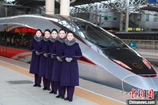 1月4日,在長春站站臺,列車乘務(wù)人員與“智能復(fù)興號”動車組拍照留念。李鵬博 攝