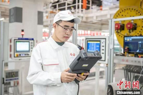 趙達(dá)在車間檢測設(shè)備。(資料圖) 中國一汽供圖