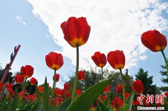 5月15日,在長(zhǎng)春市長(zhǎng)春公園內(nèi),近十萬株郁金香競(jìng)相綻放,吸引了眾多游客前來觀賞。(資料圖) 張瑤 攝
