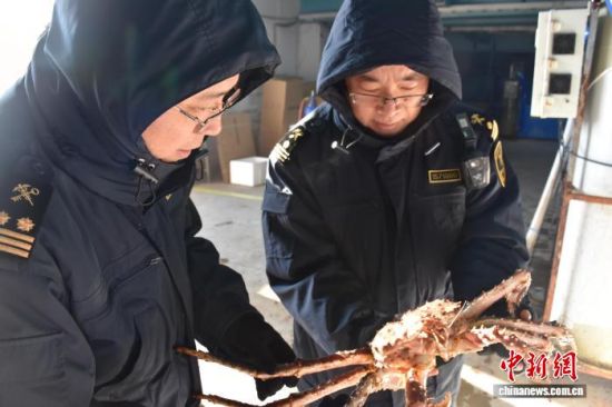 12月16日,琿春海關(guān)現(xiàn)場(chǎng)關(guān)員監(jiān)管首批通過保稅物流分撥出口的活紅帝王蟹。(長(zhǎng)春海關(guān)供圖)